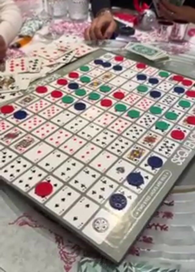The camera shows a static shot of a tabletop scene. Four people are playing a game of Sequence. A game board fills much of the view; the board is covered with images of playing cards arranged in a grid, and the players have placed plastic chips of red, green, and blue over some of the card images. Around the board are a few piles of playing cards, stacks of US dollar bills, and glassware. The people are partially visible, with their hands, arms, and torsos around the game board. One person is speaking. The table is covered with a cloth.
