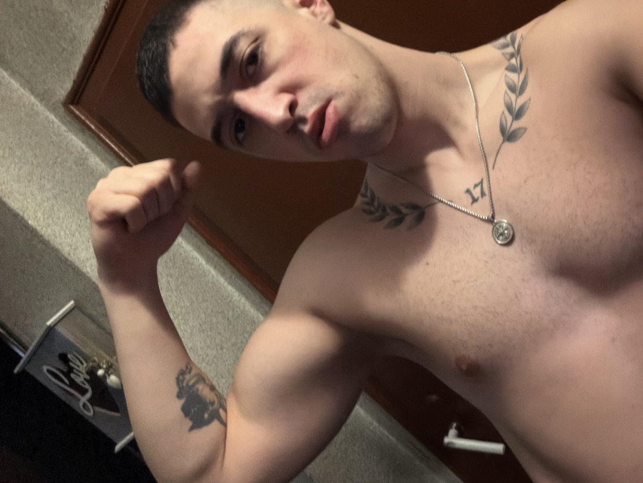 The image displays a close-up, chest-up selfie of an adult male. The subject, shirtless, faces the camera directly with a slightly pursed mouth and intense gaze. He flexes his right bicep (viewer's left arm), which is bent at the elbow with the fist clenched. The man has a short, faded haircut and dark eyebrows. Visible tattoos include a dark image resembling a cherub's head on his left bicep (viewer's right arm) and a stylized laurel wreath or two olive branches tattooed across his right shoulder and upper chest. A small number "17" tattoo is also present on his right upper chest, above the laurel design. He wears a silver-colored chain necklace with a circular, medallion-style pendant featuring an intricate design. The background consists of a light gray, textured wall. To the right, a dark brown wooden door with lighter trim is partially visible. In the upper left background, a light-colored wooden decorative object, resembling a small house or shelf with the cursive word "Love" etched into it, is partially obscured. A white fixture, possibly a pipe or handle, is partially visible on the far left. The lighting is indirect, creating shadows on the wall and the subject. The image contains no identifiable markers to pinpoint a specific location within Sofia, Bulgaria.