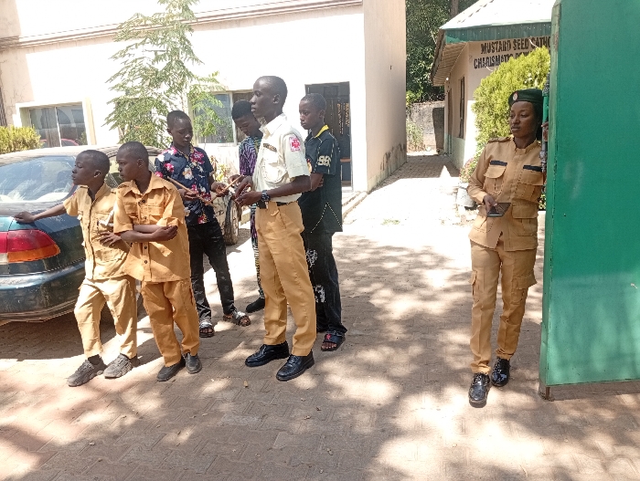 Seven individuals are depicted outdoors in a courtyard setting, identified by a partially visible sign on a building on the right that reads "MUSTARD SEED CATHOLIC CHARISMATIC POW...", indicating a religious institution in Kaduna, Nigeria. The scene is illuminated by bright daylight, casting distinct shadows on the unpaved, packed-earth ground. On the left, a dark-colored sedan is partially visible, with its rear trunk facing the viewer. Adjacent to the vehicle, a group of five males is present. Two younger males, wearing matching light-tan short-sleeved shirts and trousers, stand to the left; one has his arms crossed, and the other leans his right arm on the car's trunk, both looking towards the left. To their right, a male in a floral patterned short-sleeved shirt and dark trousers holds small, thin wooden objects in both hands. Beside him, a male in a light-tan short-sleeved shirt with a red cross emblem on the left chest pocket and matching trousers stands, holding a dark rectangular object (consistent with a mobile phone) in his left hand, appearing to interact with or address the group. Partially obscured behind him is another male wearing a dark shirt and dark trousers with sandals. On the right side of the frame, a female, dressed in a light-tan long-sleeved uniform shirt, cargo trousers, and a dark green beret, stands by a green metal gate or doorframe. She holds a dark rectangular object, likely a mobile phone, in her left hand and looks towards the left. Behind her, partially visible behind the gate, is another male in a dark shirt. A light-colored building with multiple windows is visible in the background on the left, and another building with a green roof is on the right, behind the female. Green foliage is visible in the background between the structures.