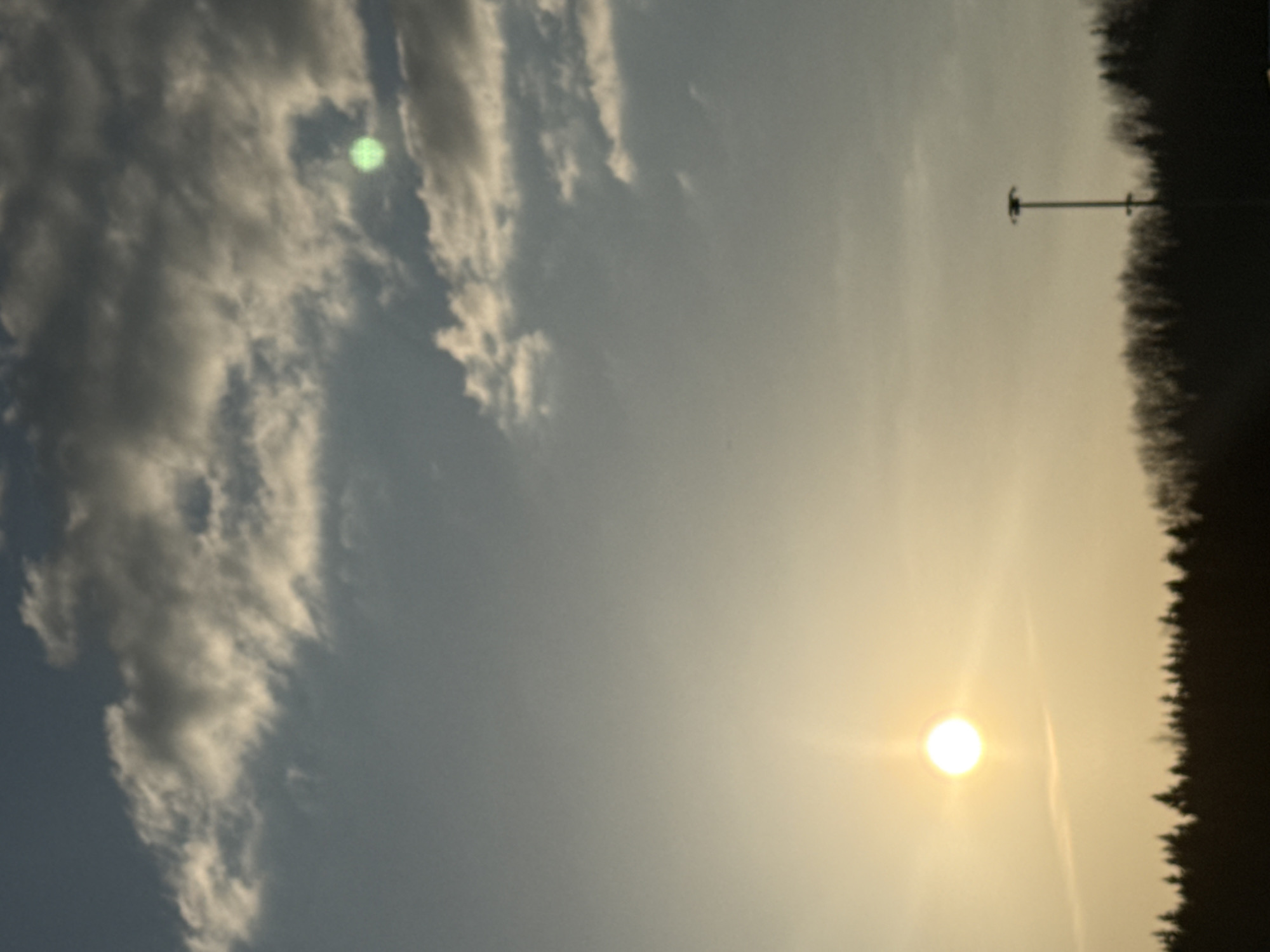 This image depicts an outdoor, rural or semi-rural scene in Lupanovo, Russia, observed during daylight hours, likely late afternoon or early evening. The sky occupies approximately two-thirds of the frame, exhibiting a gradient from light yellow-orange near the horizon to a blue-grey at the top. Numerous white and grey cumulus clouds are scattered across the upper portion of the sky. The sun, a bright white-yellow orb with visible rays, is positioned in the lower-left quadrant of the sky. A distinct green circular lens flare is visible in the upper-right quadrant, superimposed over a cloud formation. The lower third of the image is dominated by a dark, silhouetted treeline composed of deciduous and coniferous trees. A tall, slender utility pole or street light standard with multiple fixtures at its apex is visible on the right side, extending vertically above the treeline. No individuals or specific actions are discernible.