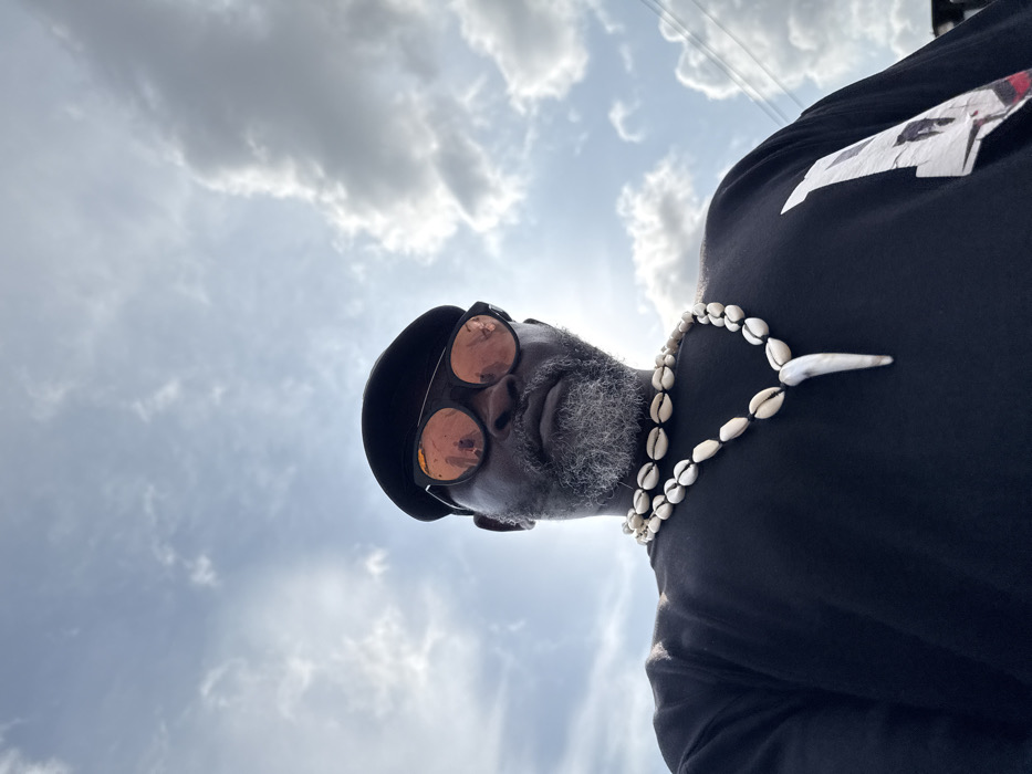 An adult male is depicted in a low-angle, close-up outdoor photograph taken in Alagbede, Nigeria. The individual, possessing a dark complexion and a grey beard, is wearing a dark flat cap, dark-framed sunglasses with reflective reddish-orange lenses, and a black short-sleeved t-shirt. A prominent multi-strand necklace, constructed from light-colored cowrie shells and featuring a central white, pointed pendant, is visible around his neck. The subject is looking directly towards the camera with a neutral expression. The background consists primarily of a bright, partly cloudy sky with visible blue patches and scattered white and grey clouds. No discernible structures or additional individuals are clearly visible in the immediate background.
