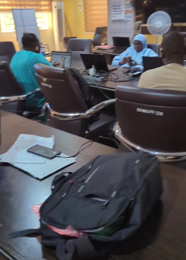 room with people sitting around a long table, seemingly engaged in some sort of meeting or workshop. The table is dark wood, and each person has a chair with a metallic silver backing. Most people are looking at laptops in front of them. A few people can be seen using their phones. On the table, there are documents and backpacks. There are window blinds behind them, a poster on the wall, and a fan in the back of the room. The people in the room appear to be of varying ages and ethnicities.