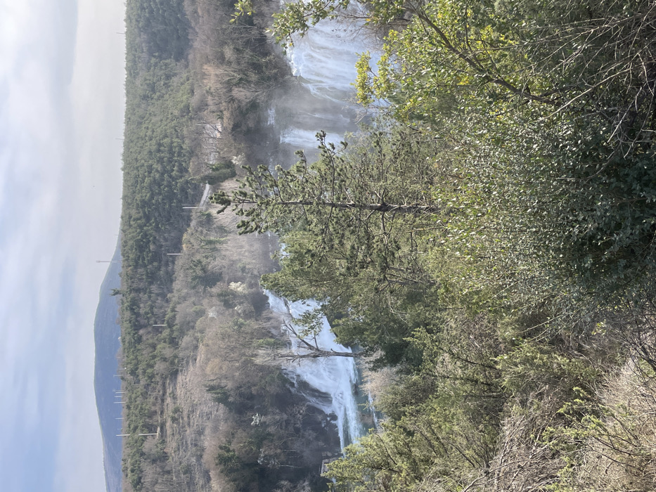 This image captures a panoramic view of the Kravica Waterfall, situated near the city of Zvirići, Bosnia and Herzegovina, observed from an elevated perspective. The immediate foreground is densely populated with a variety of green shrubs and trees, displaying both vibrant green foliage and some drier, light brown branches and undergrowth. A prominent, dark green conifer tree stands centrally in the midground, partially obscuring the left portion of the waterfalls. In the midground, the Kravica Waterfall is prominently displayed, consisting of multiple wide, turbulent cascades of white water descending over natural travertine formations into a wider, turquoise-hued river basin. Mist from the falling water is visible, particularly affecting the appearance of the trees and air surrounding the falls. Various deciduous trees, some with bare or sparse branches, and additional green conifers are interspersed around and within the waterfall area. The background features undulating hills covered extensively with dense, mixed green forestation. Several tall, slender white utility poles are discernible ascending one of the forested slopes on the left. On the distant horizon, at least two communication towers rise above the treeline on a forested peak. A winding, unpaved road or track is visible snaking through the trees on a distant hillside. The sky above is light blue with scattered white cloud formations. No human figures are present in the scene.