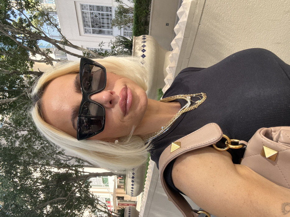 An adult female with blonde hair and darker roots, wearing dark cat-eye sunglasses, a black ribbed top, and layered gold-toned necklaces, is positioned for a selfie