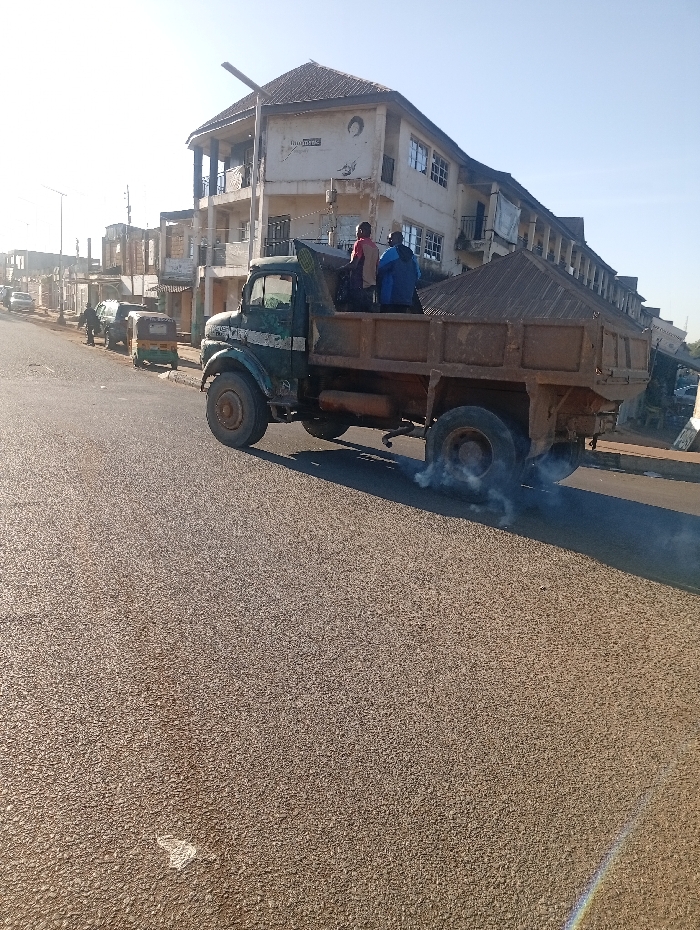 A green truck filled with material sits on an asphalt road, emitting exhaust. Two people stand in the truck bed. Buildings and other vehicles are visible in the background. The sky is light blue and clear. The street appears to be a normal city street on a sunny day. The image seems slightly tilted.