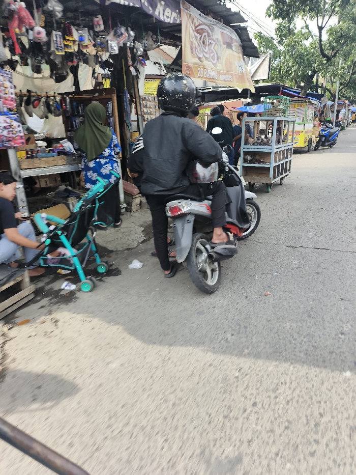 The image depicts a bustling street scene in Bandung City, Indonesia, characterized by multiple vendor stalls lining an asphalt road. In the immediate foreground, a person wearing a black motorcycle helmet, black jacket, and black pants stands astride a grey scooter with red accents. This individual wears black flip-flops. Behind the scooter, a second person, wearing a green hijab and a blue patterned long-sleeved shirt, stands facing a stall, examining hanging merchandise which includes small bags, electronics accessories, and other various items. A sign above this stall is partially visible, displaying "Ker..." and a banner with "KO3" and "20 BATANG BUNGKUS." To the left, a third person with dark hair, wearing a black t-shirt and light blue jeans, is seated on a wooden crate, attending to a teal and black baby stroller placed on the ground. Further down the street, a series of additional vendor carts are visible, including a light blue cart containing what appears to be caged birds, and a yellow food cart. The street is open for traffic, with several motorcycles parked along the right side in the distance. The environment is well-lit by daylight, casting shadows on the textured asphalt road. Green trees line the street in the background.