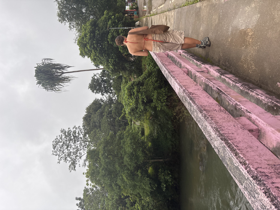 An overhead, slightly angled photographic image depicts a person walking across a concrete bridge in Khlong Sok, Thailand. The subject, viewed from behind, wears a red halter-neck bikini top, tan cargo shorts, and gray hiking shoes, carrying a brown tote bag over their left shoulder. The bridge features a weathered, faded pink concrete railing on the left, bordering a greenish-brown river flowing beneath. Dense, dark green tropical foliage, including a tall, slender tree with drooping leaves, lines the riverbanks and extends into the background. The sky is uniformly overcast. To the right of the walking subject, a wet, dark gray paved road or path with several puddles is visible, with indistinct structures in the far distance on the right.