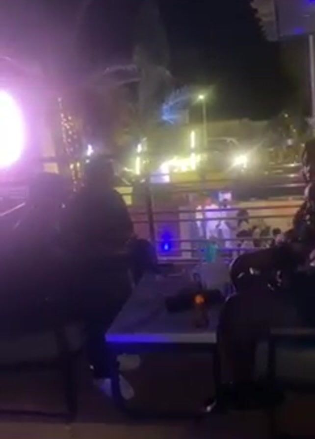 group of people sitting at tables in an outdoor setting at night. There is a brightly lit round object, possibly a light fixture, in the background on the left. Streetlights and other lights illuminate the area. There are palm trees in the background. The camera shifts to focus on a person's legs wearing blue jeans and dark shoes. The floor appears to be made of wooden planks. Music can be heard.