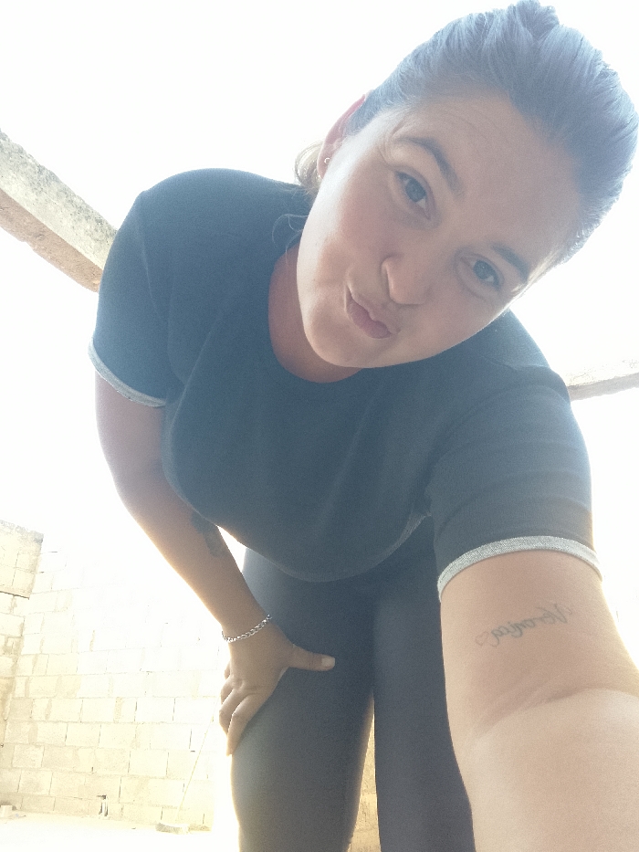 A low-angle photograph captures a woman in Altagracia, Venezuela, against an outdoor background. The subject, a woman with dark hair pulled back, is wearing a dark short-sleeved t-shirt with light grey trim on the sleeves and dark leggings. She is leaning forward and slightly to her left, looking directly at the camera with pursed lips. Her right hand, adorned with a silver-colored chain-link bracelet, rests on her upper left thigh. A script tattoo is visible on her left forearm, and another tattoo is partially visible on her right upper arm beneath the sleeve. The environment consists of a bright white sky dominating the upper frame, indicating an outdoor setting. In the lower left quadrant, an unfinished wall constructed from light-colored concrete blocks is visible, along with a diagonal, light-colored concrete beam or structural element in the upper left. This indicates the specific location within Altagracia, Venezuela is an area with rudimentary or ongoing construction, possibly a building site or an undeveloped property.