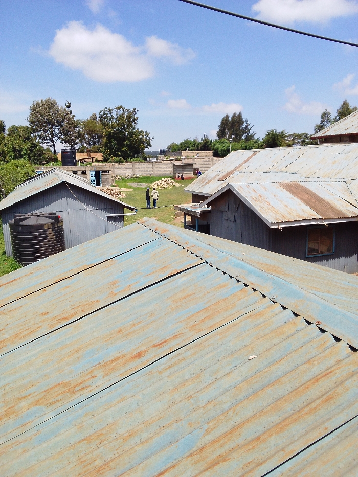 This image depicts an elevated view of a rural or semi-rural compound in Ndeiya, Kenya, under a clear blue sky with scattered white clouds