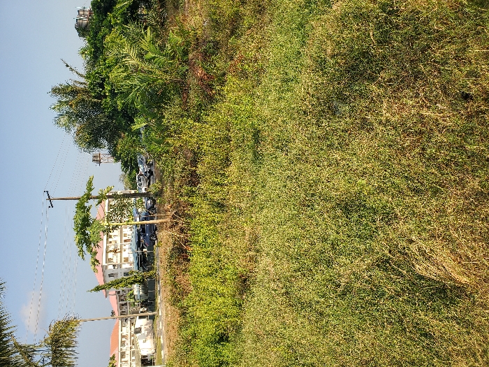 The image depicts an outdoor scene in Isunba, Nigeria, viewed from an elevated perspective over a field of dense, mixed green and dry brown vegetation that occupies the entire foreground. Beyond this unkempt field, a paved area or roadway is visible, upon which approximately eight to ten vehicles are parked. These vehicles include sedans and SUVs, predominantly dark-colored, with a white vehicle also identifiable towards the right. A wooden utility pole with overhead power lines stands centrally in the midground, to the left of which is a smaller white building. In the background, a multi-story building with a light-colored exterior and a prominent red-orange pitched roof is visible, appearing to be a residential or commercial structure. To the far right, partially obscured by dense foliage, a metallic water tower with a dark cylindrical tank is present. The sky above is clear and light blue, indicating daylight conditions. No individuals are clearly discernible within the frame.