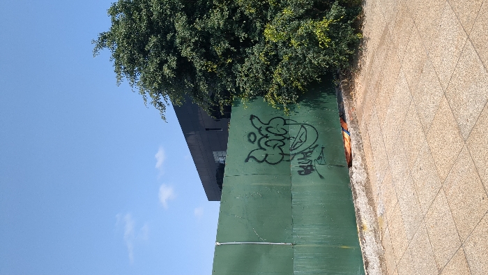 This image captures an outdoor urban scene in Hong Gai Ward, Vietnam, under a clear blue sky with minimal scattered white clouds. The foreground features a light-colored, square-tiled pavement exhibiting minor wear. A dark green corrugated metal fence, appearing weathered and horizontally panelled, extends across the midground. Prominently spray-painted in black on the fence is a cartoon-style graphic depicting a face with large eyes, an open mouth revealing a tongue, and two upper projections resembling horns or ears, with additional indistinct black graffiti below it. To the right, a dense green tree or large bush partially obscures the fence and extends upwards beyond the frame. At the base of the fence, resting on a concrete ledge, is a crumpled item of orange and brown fabric. In the background, a dark-colored building with a flat roofline and visible vertical window or panel sections is partially visible above the fence and behind the tree. No individuals or active interactions are observed.