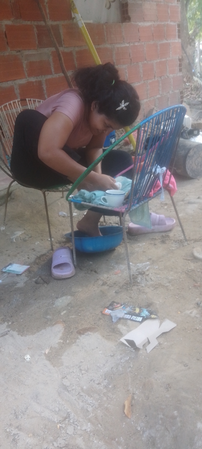A woman with dark hair pulled back sits in a green wire chair outdoors. She wears a pink top and black pants. Her feet are in a blue basin placed on the seat of another blue wire chair. A white mug and towel sit nearby. Pink slides rest on the ground, which is sandy and strewn with trash and debris. A brick wall is visible in the background. A yellow pole leans against the wall.