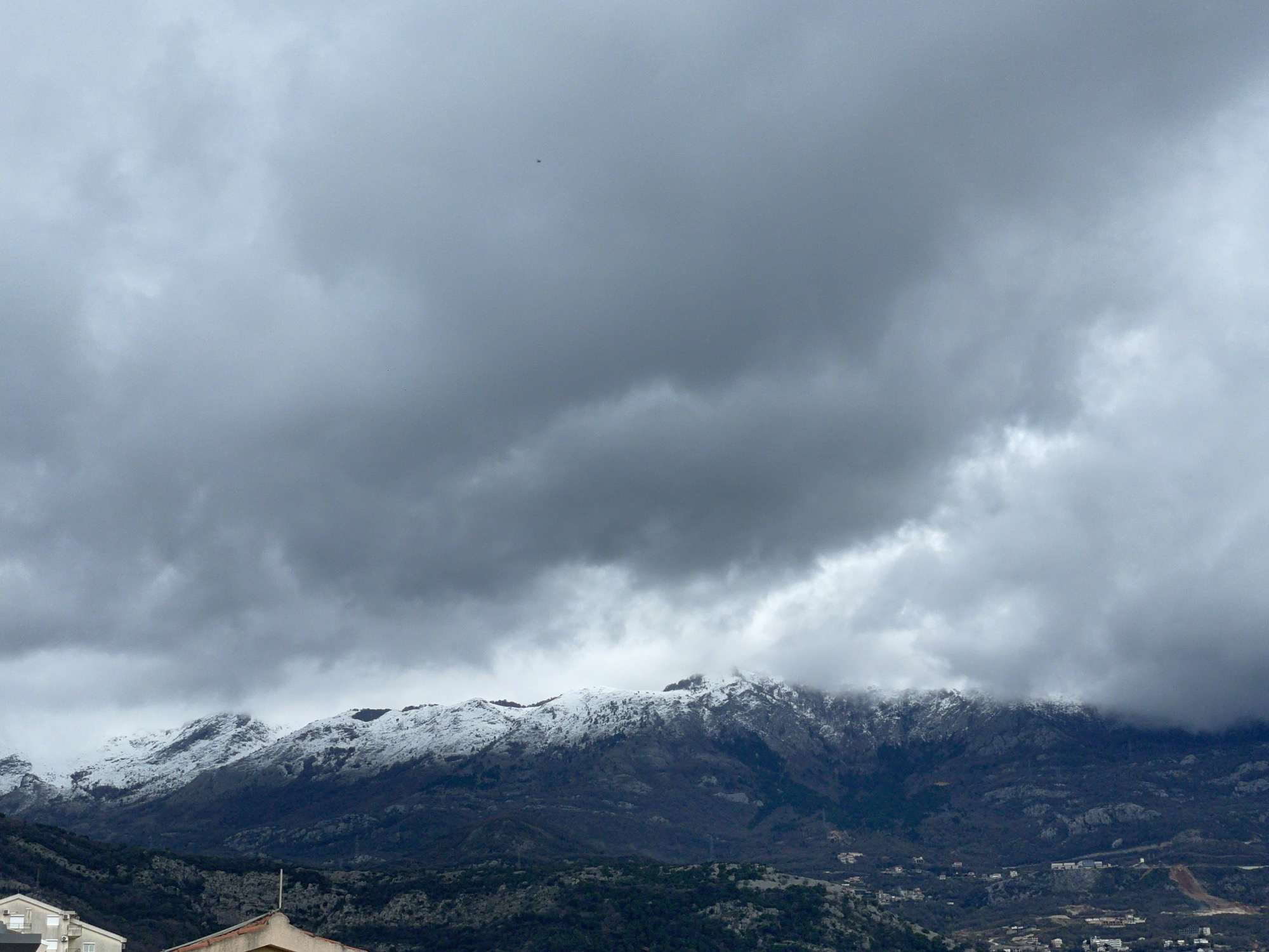 The image depicts a panoramic view of a mountainous landscape under a heavily overcast, dark grey sky. A faint, dark, unidentifiable object is present in the upper-central cloud layer. The middle ground is occupied by a mountain range, whose upper elevations are covered in white snow. The lower mountain slopes appear dark, rocky, and covered with sparse, dark vegetation. Low-hanging clouds obscure several mountain peaks, particularly towards the right side of the frame. The immediate foreground reveals partial architectural structures: a light-colored multi-story building section with windows on the left, and the orange-tiled roof of another building with a central antenna pole. Below the mountains and extending into the mid-distance, scattered residential and commercial structures are integrated into the terrain, indicating urban or suburban development. The scene is located in Budva, Montenegro, facing inland towards the snow-covered Dinaric Alps. No human subjects or discernible actions are visible within the frame.