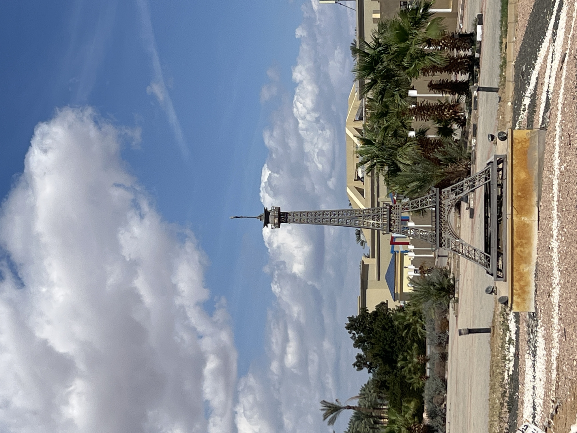 An elevated photographic image captures a miniature replica of the Eiffel Tower positioned centrally on decorative gravel landscaping in the city of Unknown, Egypt. The dark metallic tower stands on a rectangular yellowish-brown base, featuring two small black spotlights directed upwards. The surrounding ground is covered with light and dark gravel arranged in striped patterns. Behind the tower, a barren dirt or gravel area is visible, with a black bollard-like object to the left. The midground features sparse, dry vegetation, including various palm trees, and a paved or unpaved surface. In the background, several low-rise buildings with light tan facades and flat roofs are present, some with dark blue roof accents. Dense clusters of palm trees are situated around the buildings. The sky is partly cloudy, displaying significant white and grey cumulus clouds against a bright blue background. No individuals or specific activities are depicted.