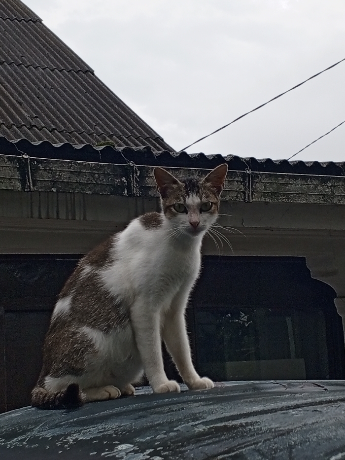 A white and brown patterned cat sits perched atop a dark, possibly metallic surface. The cat faces forward with a direct gaze. Behind the cat, the scene transitions to a weathered building structure featuring corrugated roofing and decorative trim. The sky in the background is overcast, suggesting a cloudy day. Powerlines are visible in the upper right quadrant of the frame.