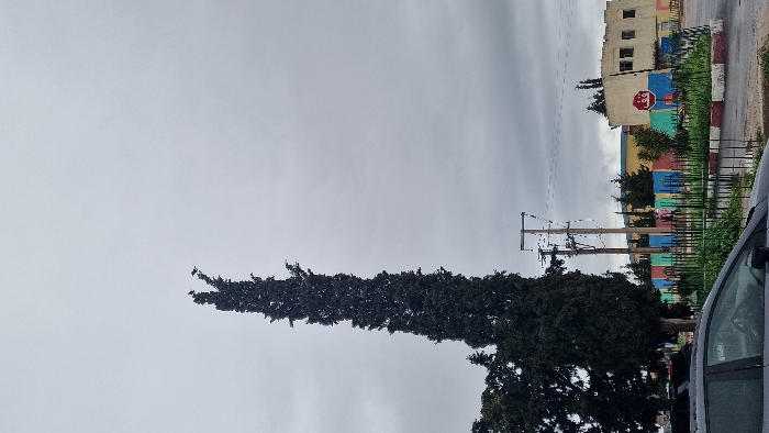 An outdoor scene in Ain Chkef, Morocco, is depicted under an overcast, grey sky. A prominent, tall, slender, dark green coniferous tree dominates the left side of the frame, reaching near the top edge; two dark birds are perched on its highest point. To the left of this tree, other dense green foliage is visible. In the foreground, the roof and upper portion of a dark-colored vehicle are partially visible on the left. The mid-ground features a circular or oval landscaped area with green plants, enclosed by a dark metal fence, with a red and white painted curb defining its edge. Beyond this, a paved surface extends. In the background, multiple utility poles with overhead power lines are visible. To the right, a building displays a wall section painted with vertical stripes of blue, green, yellow, and red. Behind and to the right of this colorful section, a lighter-colored, multi-story building with windows is present. A red octagonal stop sign, featuring white Arabic script, is mounted on a pole near the corner of the lighter-colored building. A dark, indistinct figure, possibly a person, is observable near the colorful wall, moving leftward.