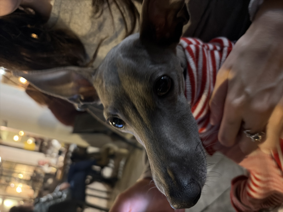 A close-up shot features a gray Italian Greyhound wearing a red and white striped sweater. The dog's face is the main focus, with its large, dark eyes and slender muzzle prominently displayed. A hand with a ring is visible to the right, suggesting someone holding the dog. The background includes blurred interior elements like lights, chairs, and people.