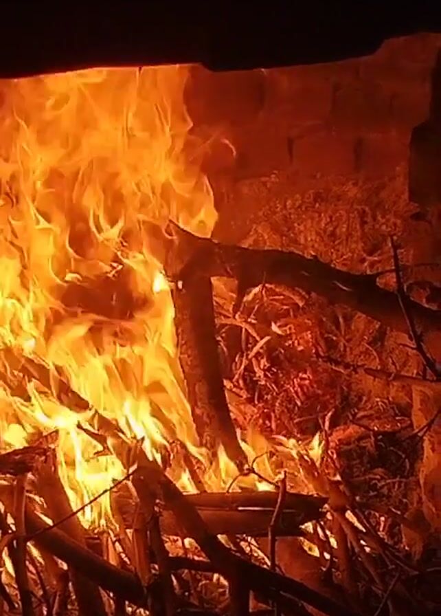 The video depicts a fire burning inside a brick structure or fireplace. The fire is large, with bright orange and yellow flames reaching high. Numerous branches and pieces of wood are visible, fueling the fire. The surrounding area is dark, with only the glow of the fire illuminating the scene. There is no indication of people or their actions in the immediate view.