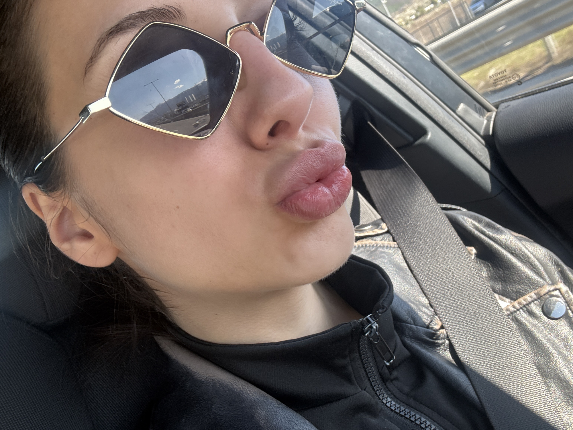 A young woman is in a car, wearing sunglasses, a black jacket, and a seatbelt