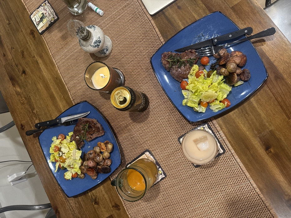 The image depicts a dining table set for two in Los Angeles, United States of America. A wooden table surface is partially covered by a light brown woven placemat or table runner. Two blue square dinner plates are arranged, each containing a cooked steak garnished with a sprig of rosemary, a side salad of light green lettuce and red cherry tomatoes, and a portion of roasted small potatoes. Each plate is accompanied by a black-handled steak knife and fork. An open black aluminum can, identified as Guinness beer, is positioned centrally. Adjacent to the beer can, a lit candle in a dark-colored glass holder casts a warm glow, and a decorative white ceramic oil lamp with blue patterns stands unlit. To the upper left, a clear glass mug containing an orange-yellow liquid rests on a coaster with a bee design. To the lower left, a clear lowball glass with a light pinkish-beige liquid and a single ice cube sits on a similar bee-themed coaster. Other objects on the table include a small rectangular coaster with an illustration and a small white and green marker near the oil lamp. A white electronic device is partially visible on the far right edge of the table. The background features a light-colored wall with an electrical outlet and white cables visible. No individuals are present in the scene.