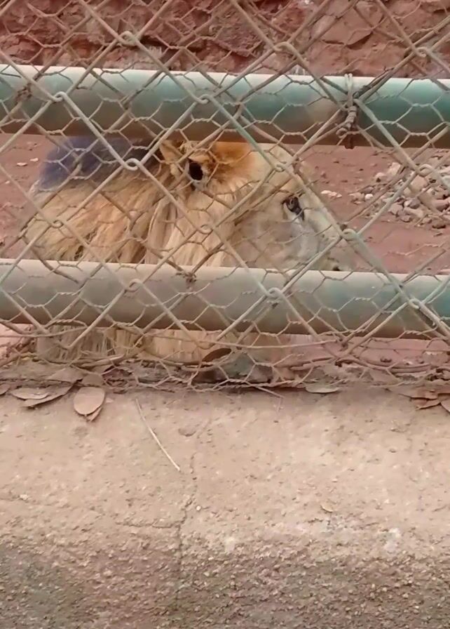 lion laying down behind a green wire fence in an enclosure. The enclosure appears to be in a zoo or similar facility, with a dirt floor and a rock wall in the background. The lion is light brown with a shaggy mane. Some dry leaves are on the ground in front of the fence. The image is a bit shaky.