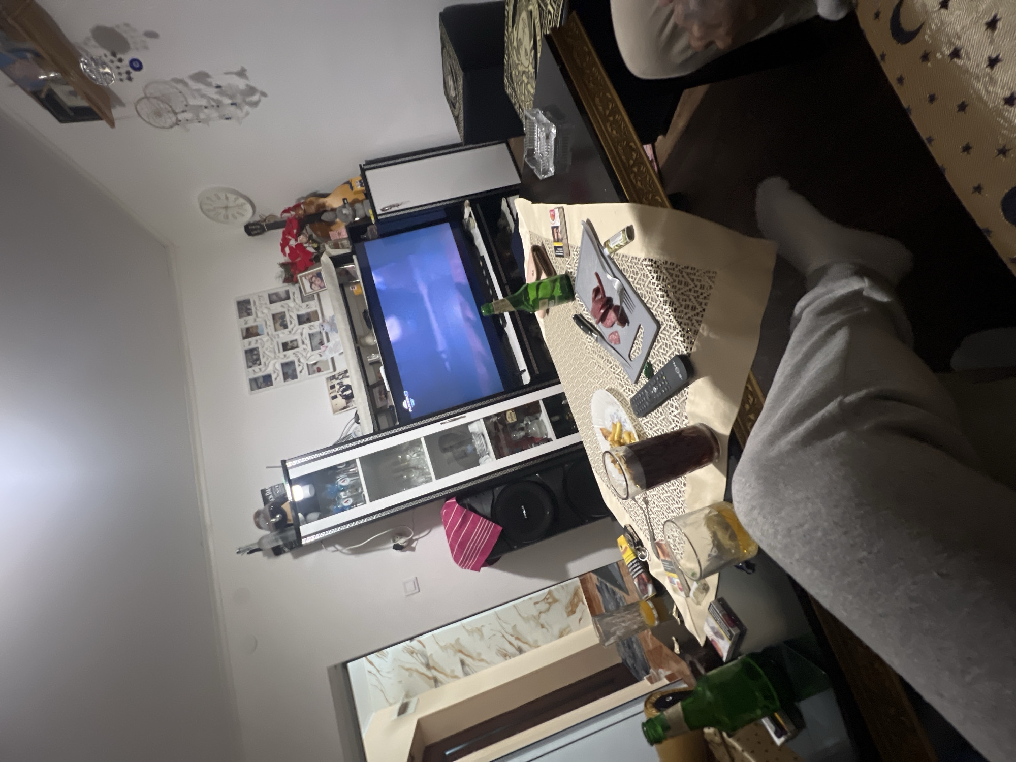 A messy indoor scene shows a TV console with a large screen, wine bottles, glasses, and food on a tablecloth. A person wearing gray sweatpants is lounging nearby. In the background, there's a wall with framed photos and decorative items, including a wall clock and ceiling decorations. The image is taken from an unusual angle, with a slightly tilted perspective.
