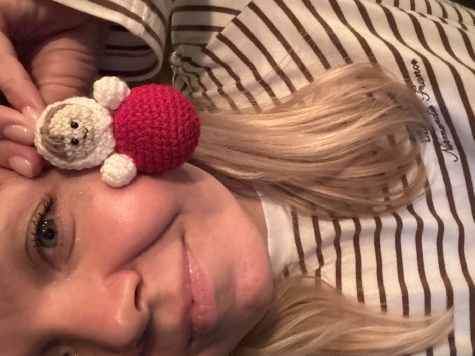 The scene depicts a close-up portrait of a fair-skinned individual, presumably female, with blonde hair, located in the city of Chaikovsky, Russia. The individual's right eye, nose, and mouth are visible, displaying a slight smile. The right eye has a visible green iris, and faint glitter is present on the adjacent cheek. The person's right hand, with manicured fingernails, holds a small crocheted doll next to the right side of their face. The doll features a light-colored head with brown hair and small stitched black facial features, white spherical limbs, and a prominent spherical magenta body. The individual is wearing a light-colored shirt with horizontal brown stripes; partial text reading "Normandie France" is visible on the shirt's lower right portion. The background is indistinct.