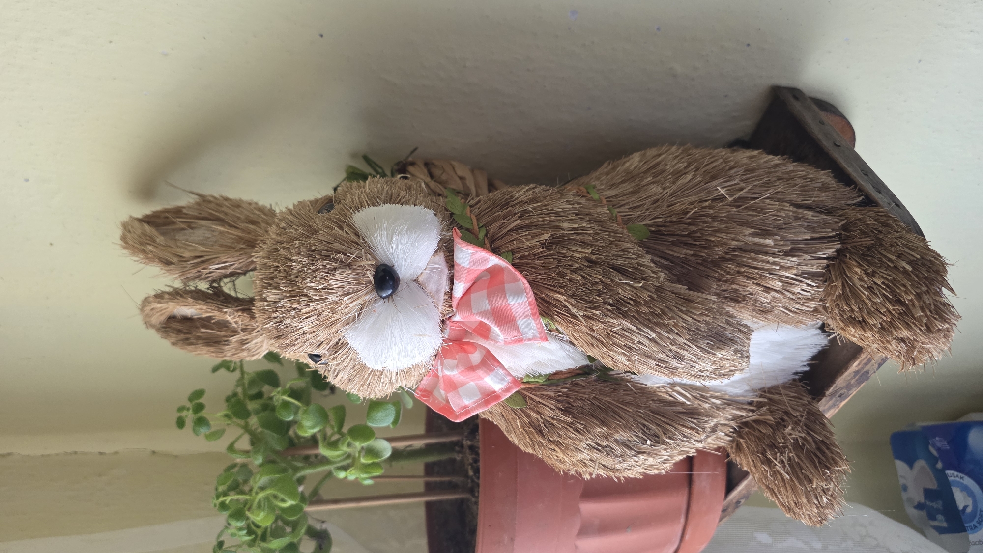 A close-up shot shows a straw bunny decoration with a pink and white checkered bow