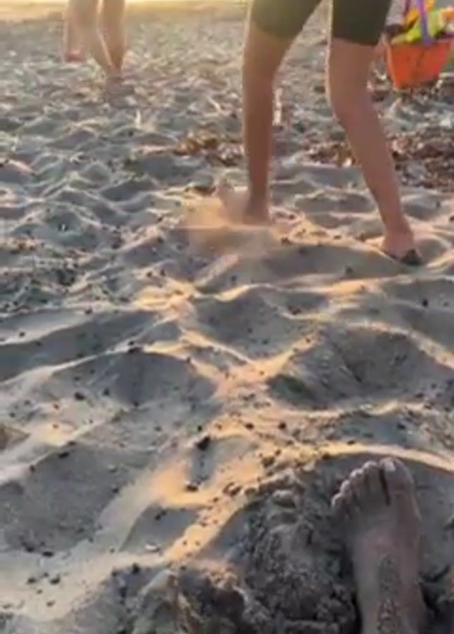 sandy beach at sunset. The foreground shows sand-covered legs, and the view shifts to a sandy beach with sparse vegetation and people walking in the distance. A child carrying a red bucket walks towards the water, followed by another child. The children walk closer to the ocean as the sun sets over the water.