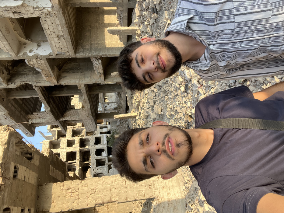 - "Two young adult males are positioned in the foreground of a severely damaged urban landscape within Joubar Municipality, Syria" by FM-WnN6r1, licensed under CC BY 4.0