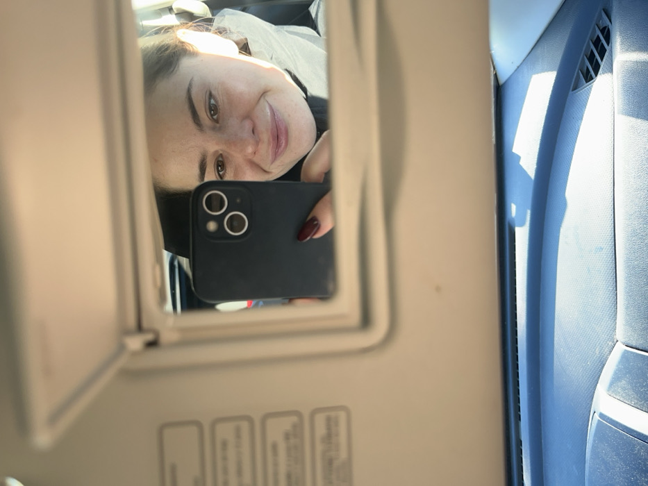 A female individual is captured in a selfie reflected in a vehicle's sun visor vanity mirror