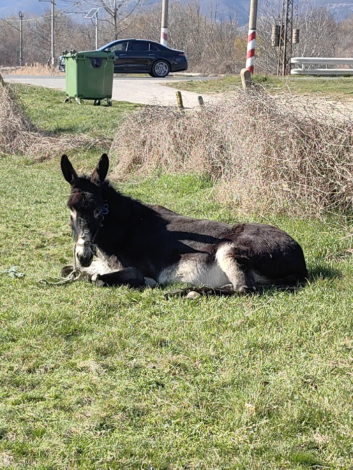 - "In Dunavtsi, Bulgaria, a dark-coated donkey is observed resting on its side on bright green grass, facing slightly left with its head raised, looking forward" by FM-tqeth1, licensed under CC BY 4.0