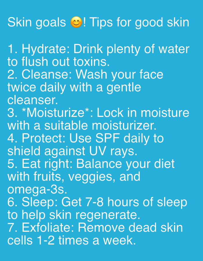 The image is a digital graphic featuring white sans-serif text on a solid light blue background, presented in the context of the city of Ketu Adieowe, Nigeria. The title at the top reads "Skin goals 😊! Tips for good skin", incorporating a yellow grinning face emoji. Below the title, a numbered list outlines seven specific tips: 1. Hydrate: Drink plenty of water to flush out toxins. 2. Cleanse: Wash your face twice daily with a gentle cleanser. 3. *Moisturize*: Lock in moisture with a suitable moisturizer. 4. Protect: Use SPF daily to shield against UV rays. 5. Eat right: Balance your diet with fruits, veggies, and omega-3s. 6. Sleep: Get 7-8 hours of sleep to help skin regenerate. 7. Exfoliate: Remove dead skin cells 1-2 times a week. The graphic depicts no people, physical objects, actions, interactions, or discernible physical environment.