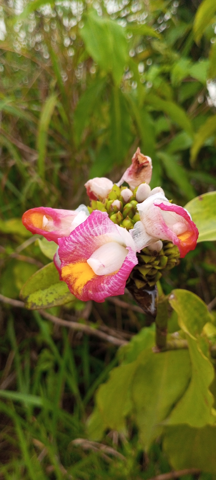 A close-up shows a vibrant flower cluster with predominantly pink and white petals, exhibiting a distinctive orange-yellow hue near the edges. The petals are striped with a darker pink, creating a textured effect. The flowers emerge from a cluster of small green buds. Lush green foliage surrounds the blooms, interspersed with blades of grass and stems. The image is slightly blurry, lending a soft, natural feel.