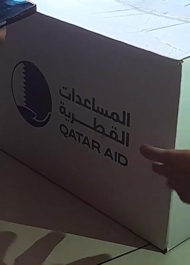 large, closed cardboard box with the "Qatar Aid" logo printed on its side