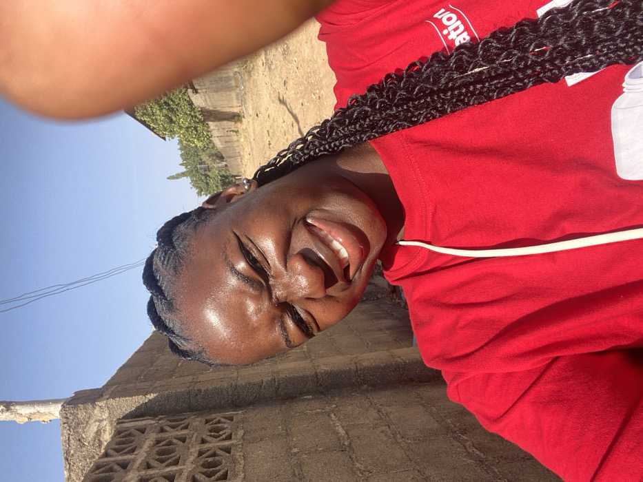 A female individual with dark skin and braided hair, styled in cornrows at the hairline transitioning to micro-braids, is depicted in a close-up, front-facing selfie outdoors in Sabon Tasha, Nigeria