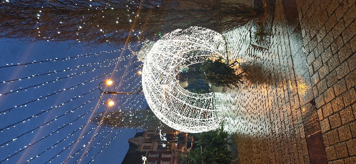 The scene depicts an urban outdoor area in Lens, France, at dusk or night. A large, spherical, white light sculpture, designed as an archway, occupies the central foreground. Smaller green coniferous trees are positioned within and around this primary light structure. Above, numerous parallel strands of white lights are suspended, forming an illuminated canopy against a deep blue sky. A two-bulb streetlamp, emitting warm yellow light, is visible in the upper-mid-ground. Multi-story buildings with illuminated windows are present in the left background. The foreground features wet, reflective cobblestone paving. A tall, bare-branched tree stands on the right side of the frame. No individuals or vehicles are visible.