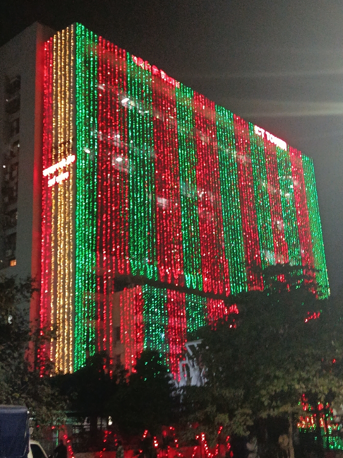 An exterior, low-angle night photograph depicts the ICT Tower, located in Agargaon, Dhaka, Bangladesh. The multi-story building facade is extensively covered with vertical strips of decorative string lights. The primary illumination consists of alternating wide vertical bands of red and green lights across the majority of the visible structure. A thinner, yellow-gold vertical stripe of lights is present on the far left edge of the building. The words "ICT TOWER" are illuminated in red on the upper right section of the building. The sky above is dark. In the foreground, dark green foliage, consistent with trees and shrubs, partially obscures the lower levels of the building, with scattered red lights visible within the ground-level vegetation. A small portion of a light-colored vehicle is partially visible on the far left at street level. No individuals or specific human activities are discernible.