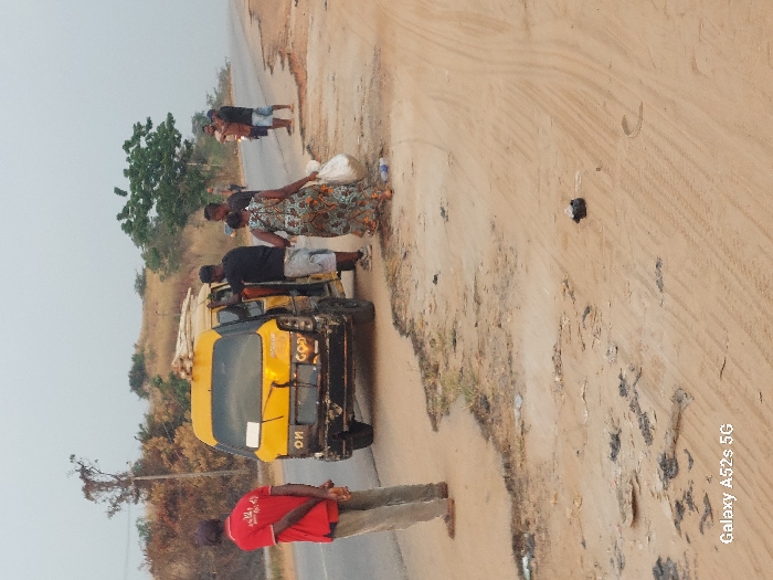 A yellow vehicle is parked on the side of a road with several people around it. One person in a red shirt stands to the side. Several individuals are gathered near the vehicle, some holding white bags. A few other people stand farther away in the distance. The surroundings appear to be a rural area with dry, sandy terrain.