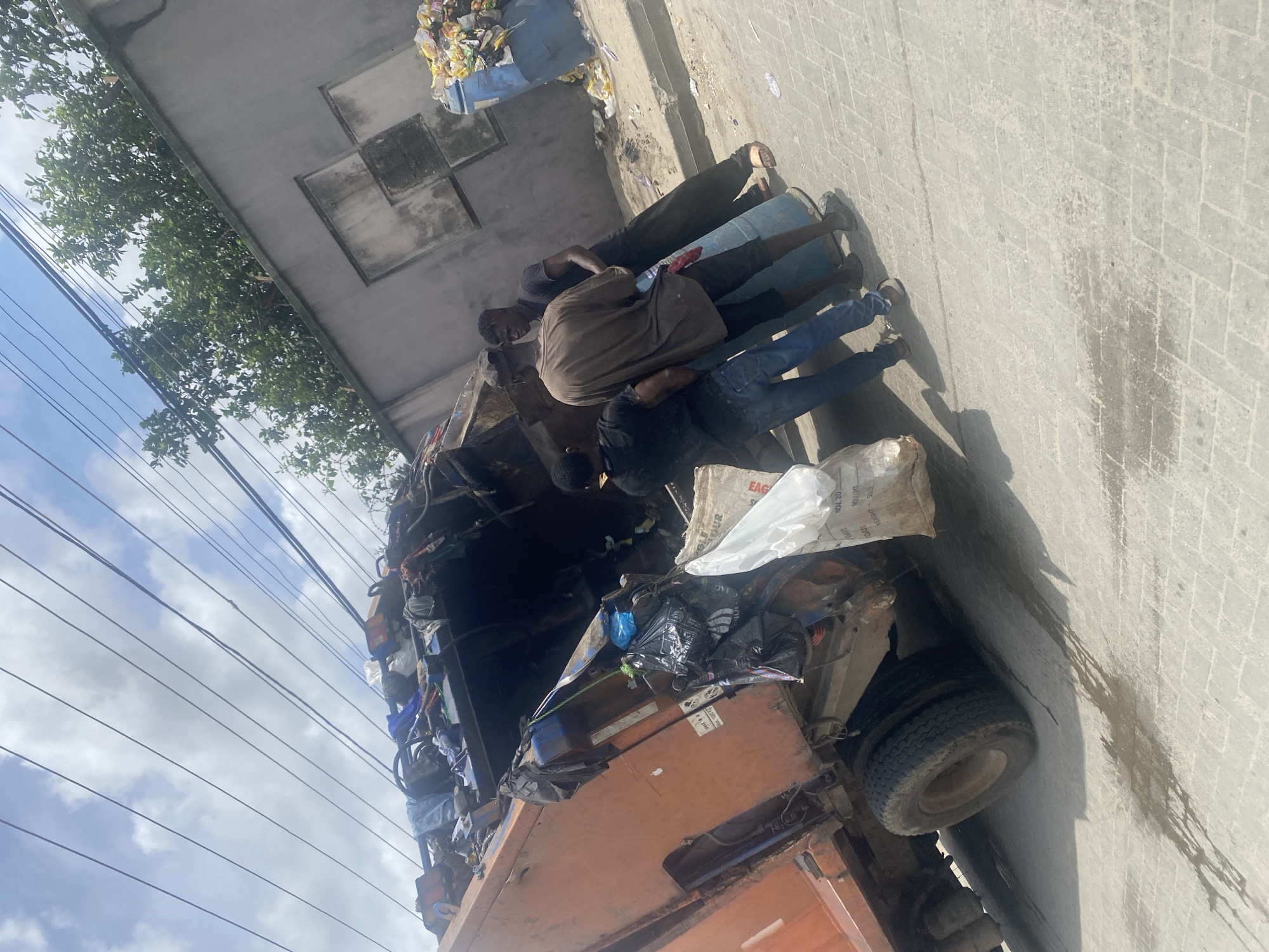 This image, captured in Iranla, Nigeria, depicts an outdoor scene featuring an orange refuse collection truck on a paved surface
