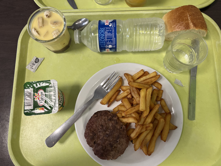 A light-green plastic cafeteria tray displays a prepared meal, observed from an overhead perspective in a French institutional cafeteria setting, likely within the city of Caen, France. The tray holds a white round plate centrally positioned, containing a large, cooked, brown beef patty on the left side and a generous pile of golden-brown french fries on the right. A silver-colored metal fork rests across the plate, with its tines pointing towards the fries. To the upper left of the plate, a green-lidded Panier de Yoplait brand yogurt cup, identified as "Pêche" (peach) flavor, is visible. Adjacent to it, a small white paper sachet labeled "Sel" (salt) rests on the tray. In the upper right quadrant of the tray, a clear glass contains a light yellow, viscous liquid with several irregular white pieces of fruit, consistent with sliced banana, floating within. A small silver spoon is partially visible behind this glass. Below the beverage glass, a 50cl clear plastic bottle of Cristaline Éléonore spring water stands mostly full, with its blue and white label clearly legible. Towards the bottom right of the tray, a section of white bread, resembling a piece of baguette, lies horizontally. An inverted clear plastic drinking glass rests partially on this bread and the tray. A silver-colored metal knife is positioned horizontally on the tray below the plate and the inverted glass, with its handle pointing left. A small, irregular piece of torn white paper is situated near the inverted glass. The background beyond the tray is dark, suggesting a tabletop or counter surface. A portion of another light-green tray or surface is visible along the far right edge of the image. No individuals are present in the scene. The meal appears recently assembled, awaiting consumption.
