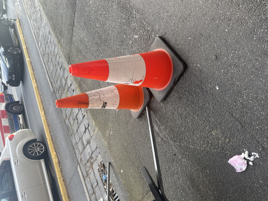 The image displays a street scene in Carlton, Australia. In the immediate foreground, two orange traffic cones with faded, peeling white reflective bands stand on dark asphalt pavement. The left cone has "DOG" visible on its white section. Both cones are anchored by black square rubber bases. A silver metal bar extends from the lower-left corner of the frame, passing beneath the base of the left cone. A crumpled pink wrapper and white debris are scattered on the asphalt below the bar. To the left of the cones, a metal grate covers a drainage gutter containing assorted debris. Behind the gutter, a section of uneven, block-patterned pavement is visible, followed by a yellow painted curb. The background reveals a multi-lane asphalt roadway with traffic. A white sedan is parked or moving on the far left. To its right, a white van with red stripes is in motion. Further right, a dark sedan, bearing the Australian license plate "DNC 909," is visible. A faint yellow line runs along the road surface in the mid-ground. No people are present.