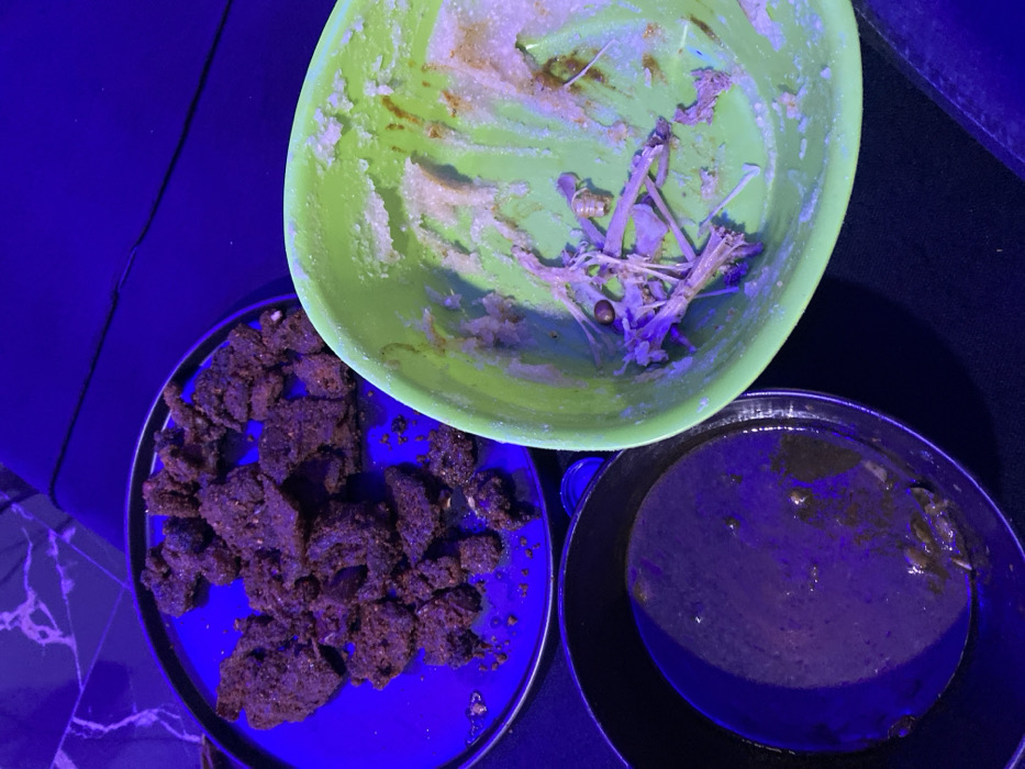 An overhead shot, heavily illuminated by blue ambient light, depicts remnants of a meal on a dark surface in Moniya, Nigeria