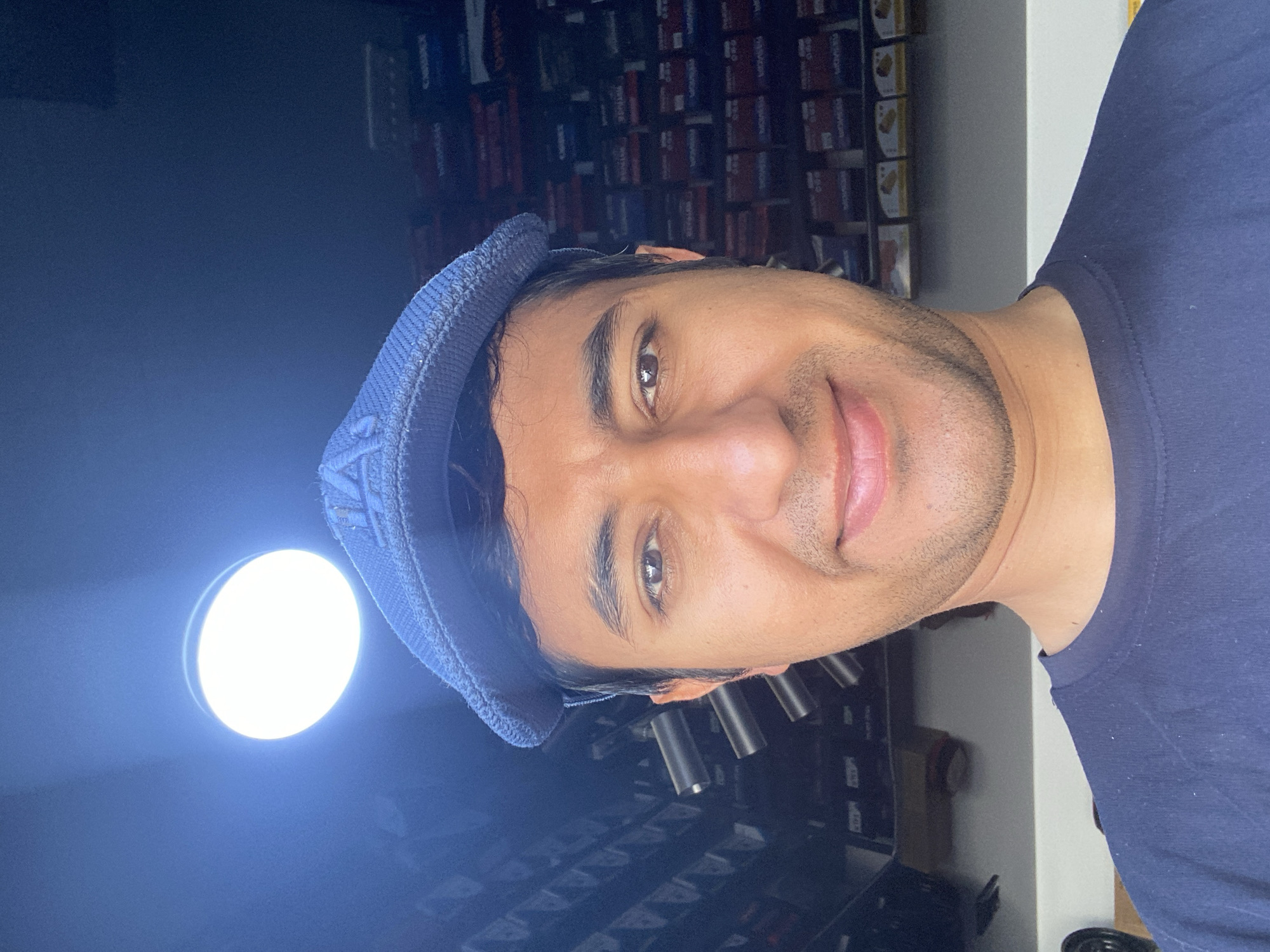 A medium shot, portrait-style image, rotated counter-clockwise, shows a man with medium skin tone, wearing a blue knit cap and a navy blue t-shirt. He is smiling slightly. His hair is dark, and he has dark eyebrows. He appears to be indoors, positioned in front of shelves stocked with various items, including what appear to be small containers or boxes. A bright light source is visible to the left of his head, casting a glow. The background, particularly the shelf items, are slightly out of focus. There is no visual information available in the image that directly identifies the city of Bukhara, Uzbekistan.