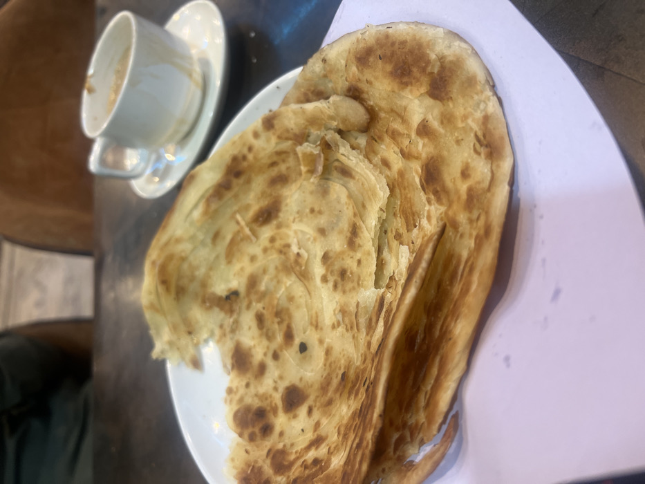 A close-up, high-angle photograph captures a meal setting indoors, identified as Koliya, Pakistan. In the foreground, a partially consumed or torn golden-brown flatbread, consistent with a paratha, rests on a white ceramic plate. The flatbread exhibits distinct layers and visible darker, cooked spots. To the right and slightly out of focus, a white ceramic teacup with a handle sits on a matching saucer. The cup contains a light brown liquid, and faint streaks of the liquid are visible on its exterior and the saucer. The plate and saucer are positioned on a dark, reflective tabletop. The background is blurred, revealing indistinct shapes including a brown surface consistent with a chair back on the right and a darker fabric or object on the left. No individuals are visible.