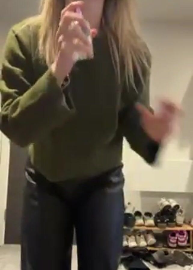 A woman is spraying perfume in front of a camera. She is wearing a green sweater, black leather pants, gold hoop earrings, and a black headband. The background shows shoes on a shelf and a white wall. The lighting is from an overhead light. The camera is static.
