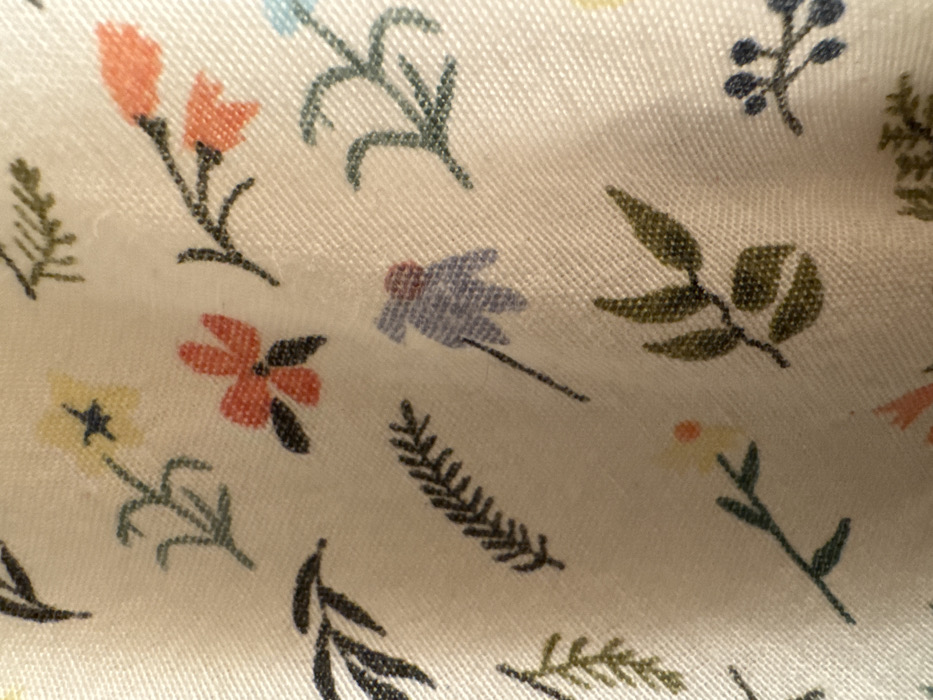 - "The scene, located in Fowlis Easter, United Kingdom, depicts a close-up view of an off-white textile fabric featuring a repeating printed floral and botanical pattern" by FM-aaYws2, licensed under CC BY 4.0