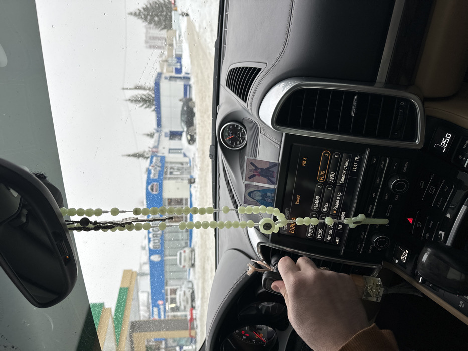 - "An interior view from a stationary vehicle, identified as a Porsche Cayenne based on the dashboard layout, looks out through a water-spattered windshield at a snow-covered urban environment in Kazan, Russia" by FM-KTJV22, licensed under CC BY 4.0