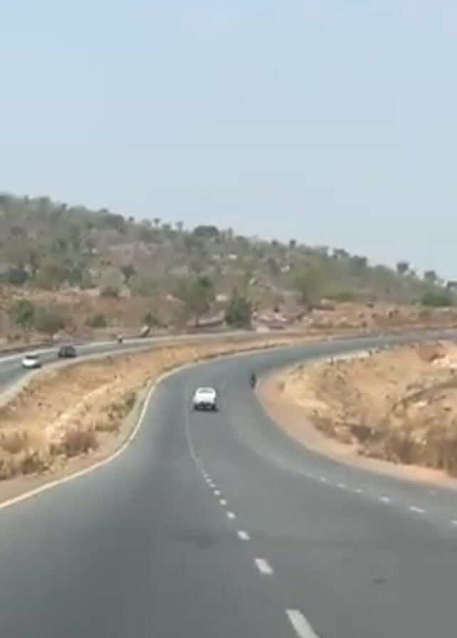 The video depicts a view from inside a moving vehicle, looking out onto a winding highway